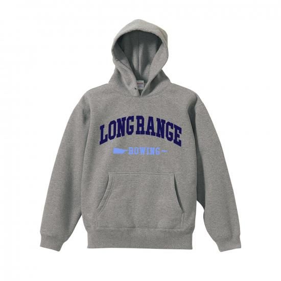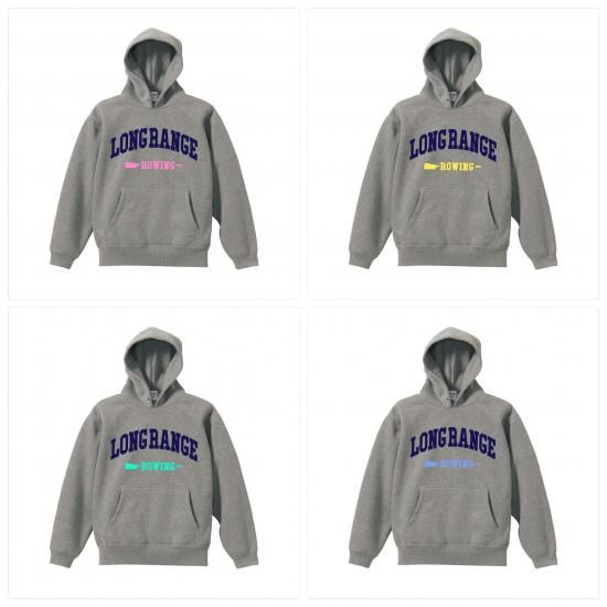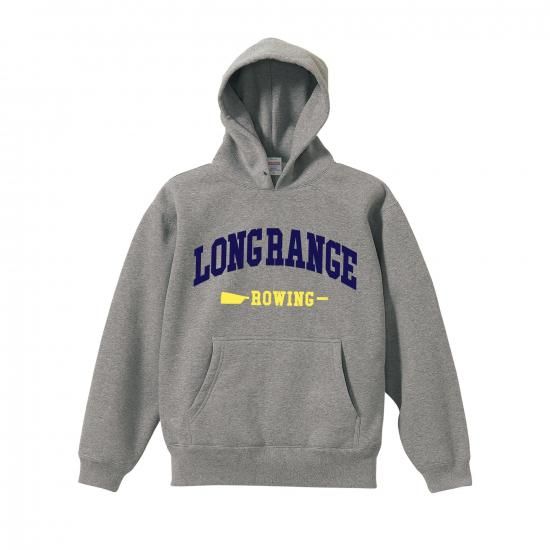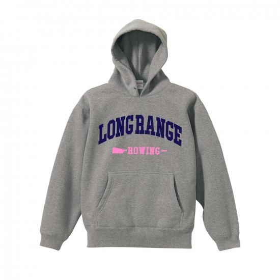 前身ごろにLONG RANGE ネイビープリントとオールモチーフとROWINGのロゴはパステルカラーを組み合わせのカレッジロゴ風プリント。